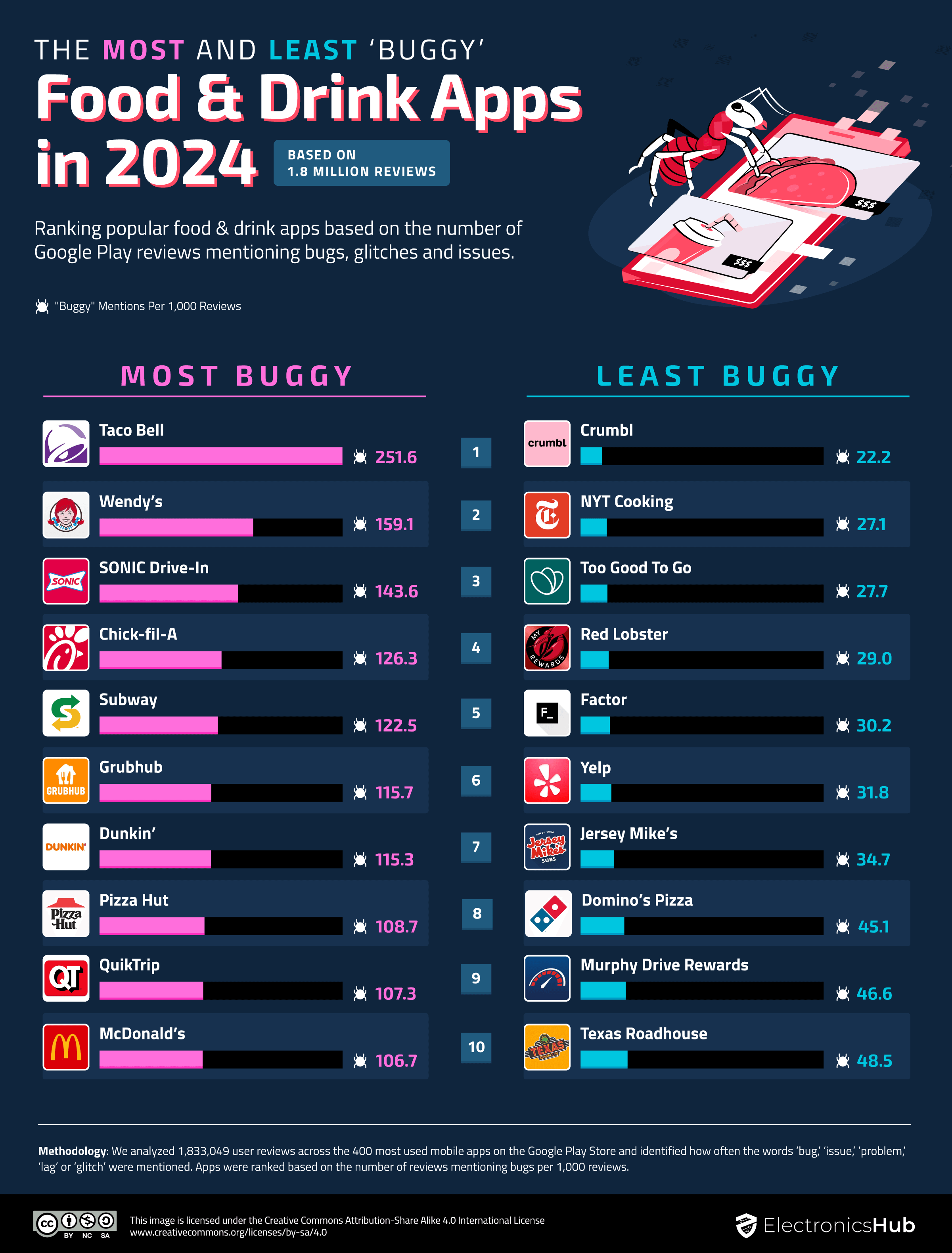 Similarly, big-name fast-food chains dominate our ranking of the buggiest apps in the food and drink category, with Taco Bell taking the overall title (251.6 mentions of bugs and app issues per 1,000 reviews). “Works some days, completely unusable others,” writes a reviewer. “UI is good … but there are some days where the app just simply refuses to put your order through.” Next comes Wendy’s (159.1 mentions), SONIC Drive-In (143.6 mentions) and Chick-fil-A (126.3 mentions).