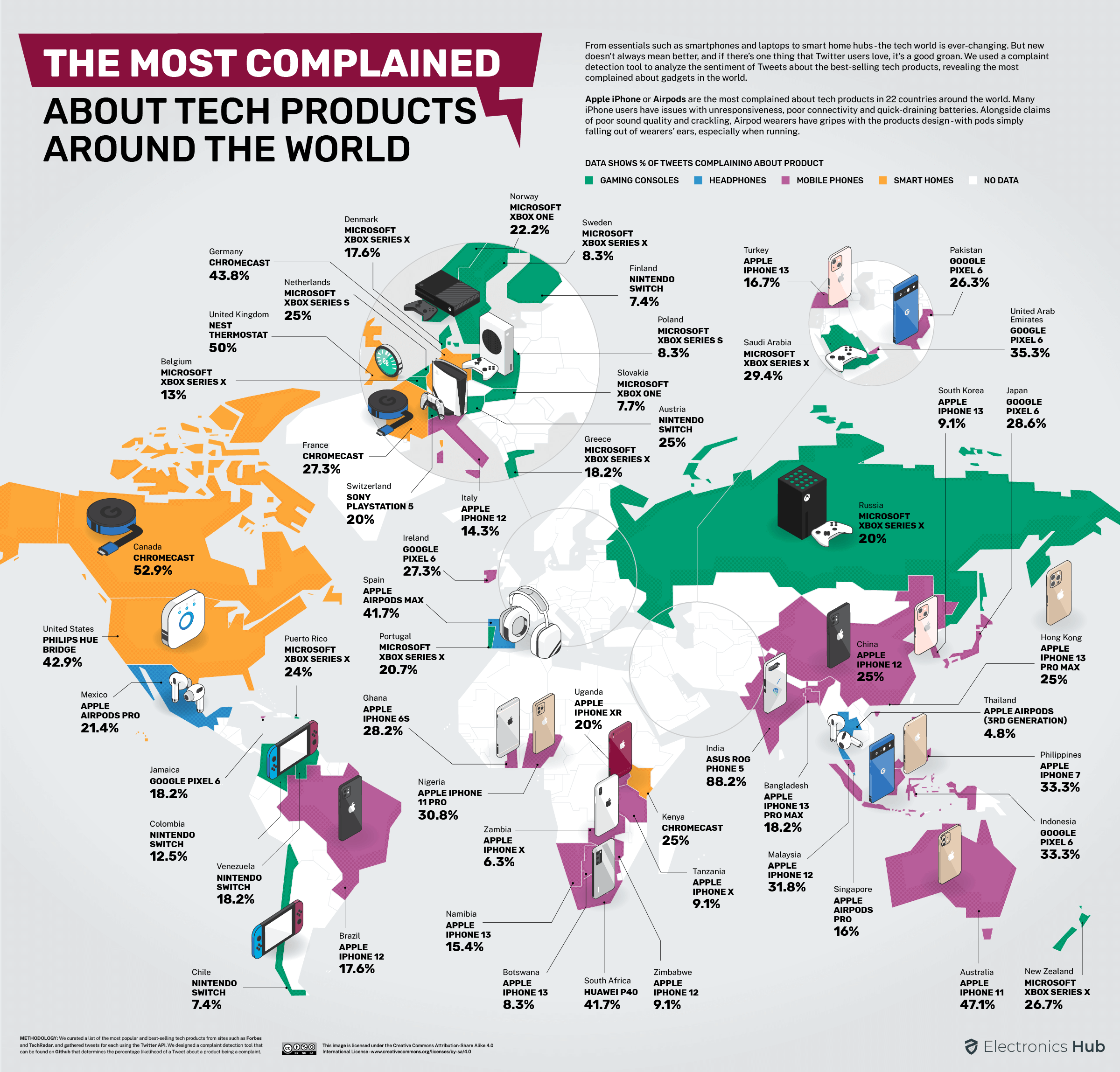 So which are the products that we complain about the most on the socials? Electronics Hub developed a complaint detection tool to analyze thousands of tweets mentioning popular tech products and gave each gadget a score based on the percentage of tweets that feature a complaint.