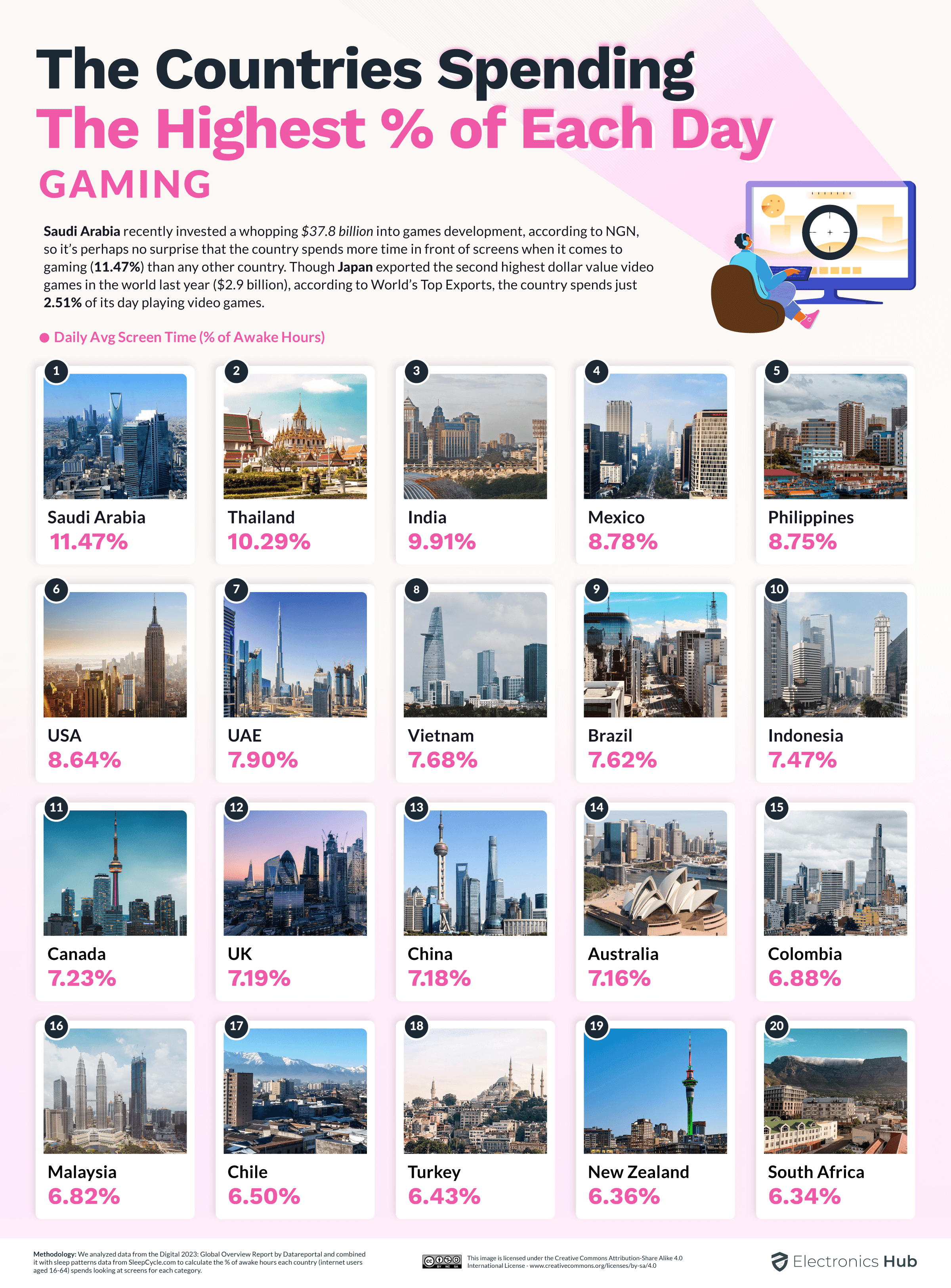 - Saudi Arabians are the most prolific players spending 11.5% of their day gaming.