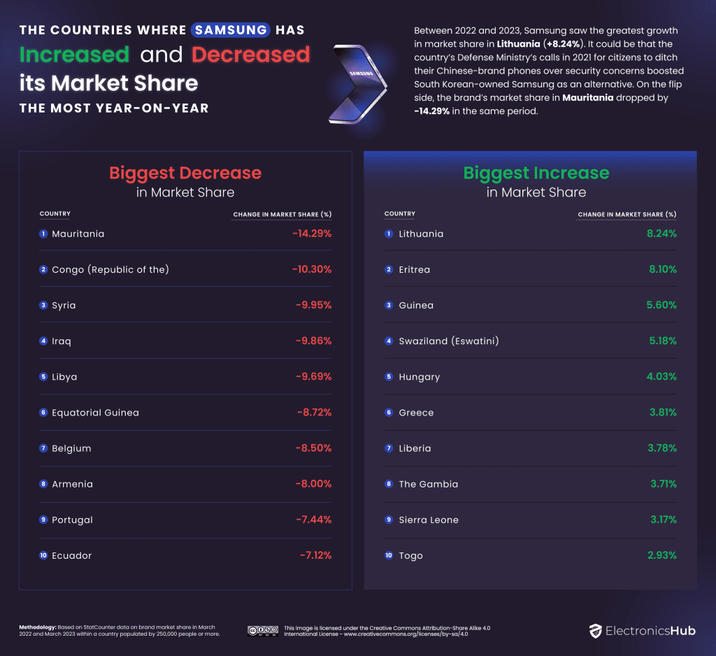 In contrast, Samsung’s control of the cell phone market has dropped the most in Mauritania (-14.29%). It’s not all been smooth sailing for the brand in recent months, thanks to a major data leak as a result of employees using the AI program ChatGPT to help fix coding problems.