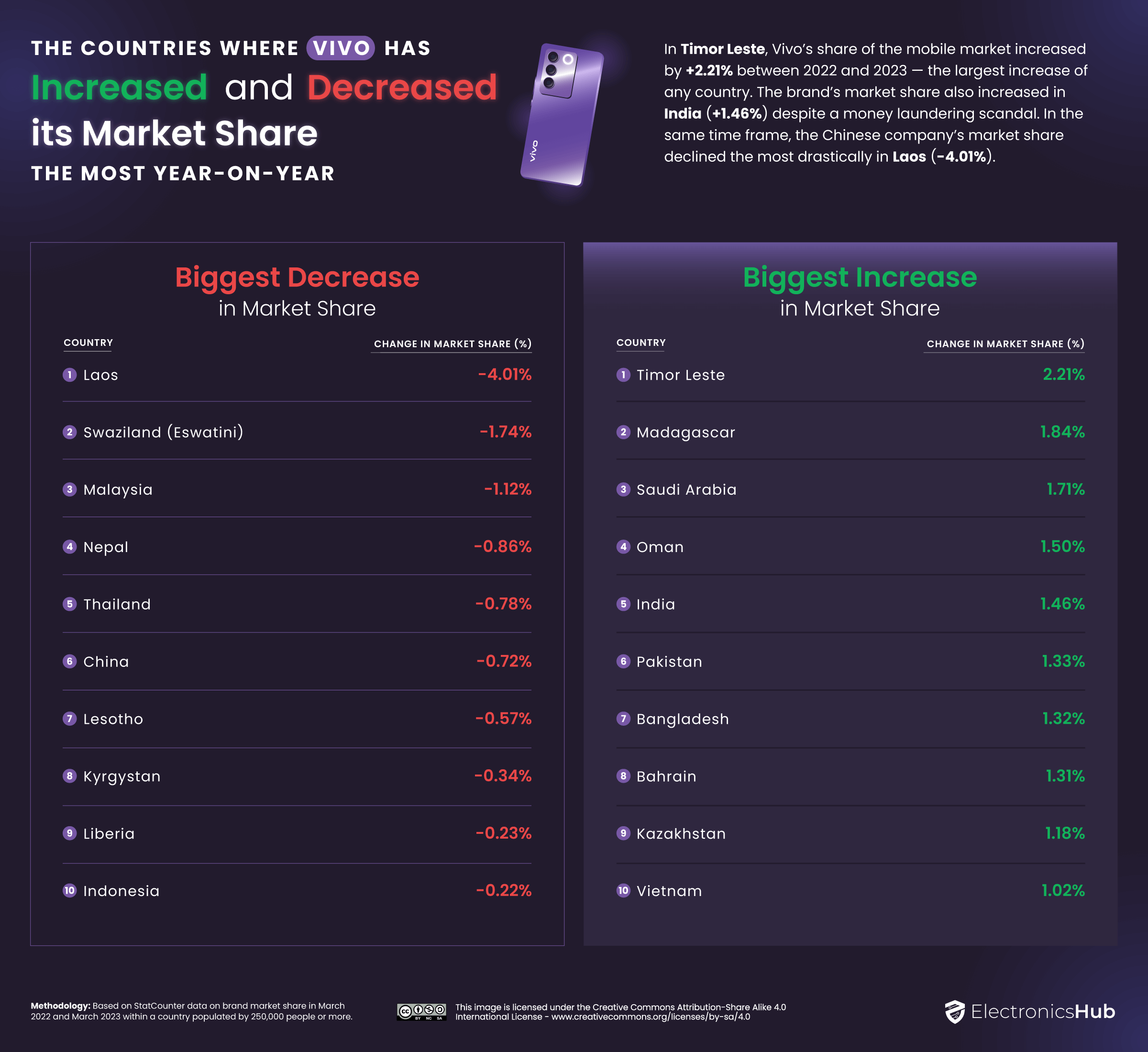 Between 2022 and 2023, Vivo saw its hold on the cell phone market in India increase by 1.46%, the fifth-highest rate in the world. Despite a major money laundering scandal, Vivo shows no signs of slowing down in India, with plans set to increase manufacturing locally.