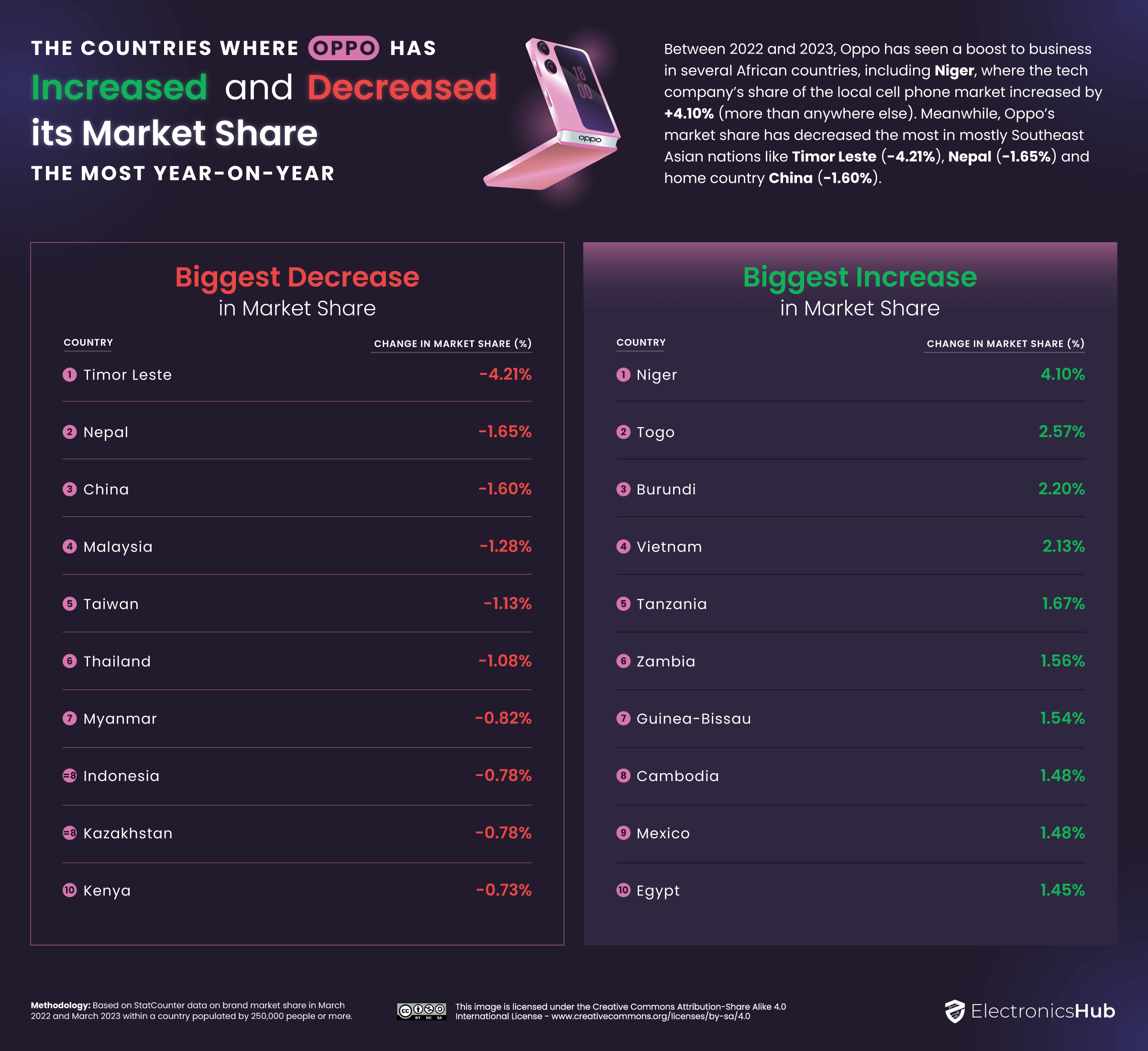 Seven of the top 10 countries in which Oppo has seen the biggest market share increase between 2022 and 2023 are in Africa, led by Niger (+4.10%). It seems affordable, high-performance Chinese smartphones (like Oppo’s) are providing a boost to the continent’s digital economy.