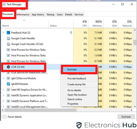 Right-click on this option and select “End task”. Also, make sure that there are no other instances of the iCUE Software running in the background. You can notice this by looking at the taskbar tray.