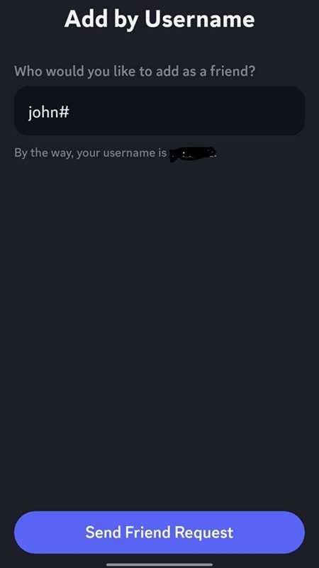 - Enter the user’s Discord Tag in the text box, then tap “Send Friend Request.“