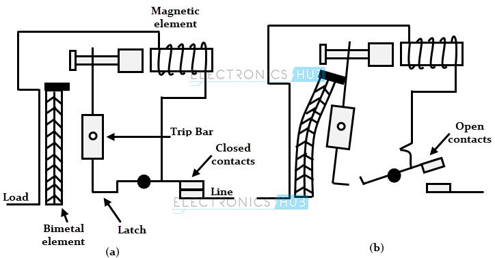 With the use of bimetallic strip, thermal operation is achieved in case overload conditions. When overload current flows through the MCB, the bimetallic strip gets heated and causes to deflect. In doing so, it moves the trip lever and releases the latch mechanism and hence the contacts open under spring mechanism.