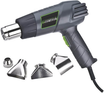 The Genesis GHG1500A is one of the best 1500/750W heat gun kits out there. It comes with an air reduction nozzle and makes adjustments depending on your project. You can swap between three temperatures to get the desired results.