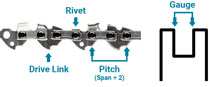 Pitch is the distance between one drive link and another. To measure the pitch, calculate the distance between 3 consecutive rivets. Now, divide the value by 2. This will give you the pitch measurement. Most chains have a pitch dimension of ⅜ inches and .325 inches.