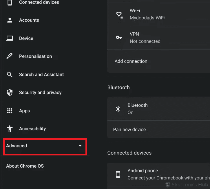 - In the settings menu, scroll down and click on “Advanced” on the left.