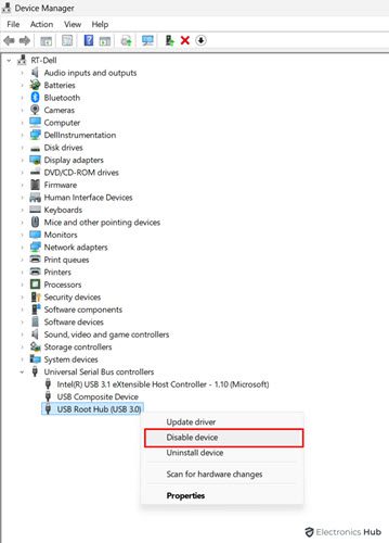 - Once you identified the USB Root Hub you wish to disable, right-click on it and select “Disable device.”