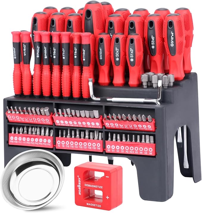 The handles of the HORUSDY screwdrivers are designed with comfort in mind. The ergonomic TPR handles provide a non-slip grip, allowing for maximum torque while minimizing hand fatigue during prolonged use. The set’s inclusion of a durable plastic racking shelf for organization exemplifies the thoughtful design, keeping the tools neatly arranged and readily accessible for any project.