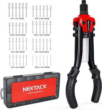 | NEXTACK Rivet Gun | 1/4"(6.4mm), 3/16"(4.8mm), 5/32"(4.0mm), 1/8"(3.2mm), and 3/32"(2.4mm) | Aluminum alloy, carbon steel | 350 Pcs | Check On Amazon |