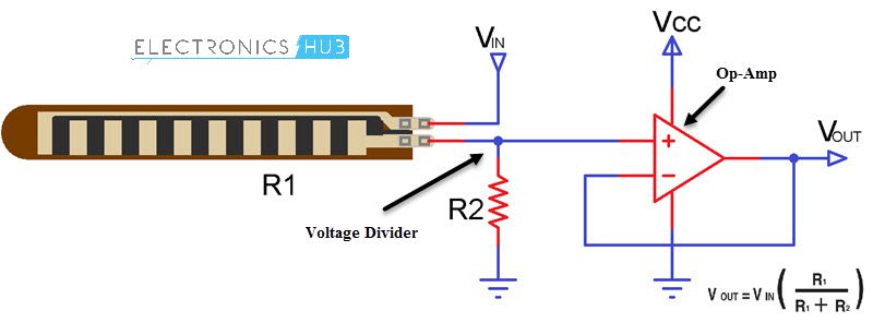 The following image shows the basic flex sensor circuit consisting of a voltage divider (formed by the flex sensor itself and a 10KΩ Resistor) and an Operational Amplifier (Op-Amp).