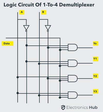 The input bit is labelled as Data D. This data bit is transmitted to the selected output lines, which depends on the values of A and B, the control or Select Inputs.