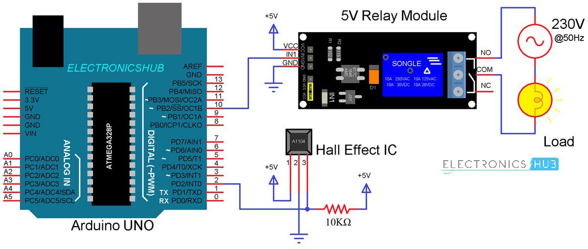 As usual, I will implement two circuits: one is the basic hook-up guide of Hall Effect Sensor with Arduino and the second one is an application circuit where I will control a relay with the help of Hall Effect Sensor and Arduino.