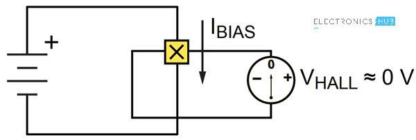 When a constant voltage is given at VCC, some small but constant current flows through the semiconductor sheet. When there is no magnetic field, the voltage VHALL, which is measured across the width of the Hall Element (semiconductor sheet) will be approximately equal to 0V.