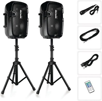 Along with that, it offers a powerful output thanks to the 2000-watt RMS power capacity. The package includes 2 two-way speakers, a high-quality mic, speaker stands, and necessary cables for connections. The speakers are multi-functional as you can even use them via Bluetooth connection, USB drives, and SD cards. And even without any source, you can simply turn on the FM radio directly on the speaker.