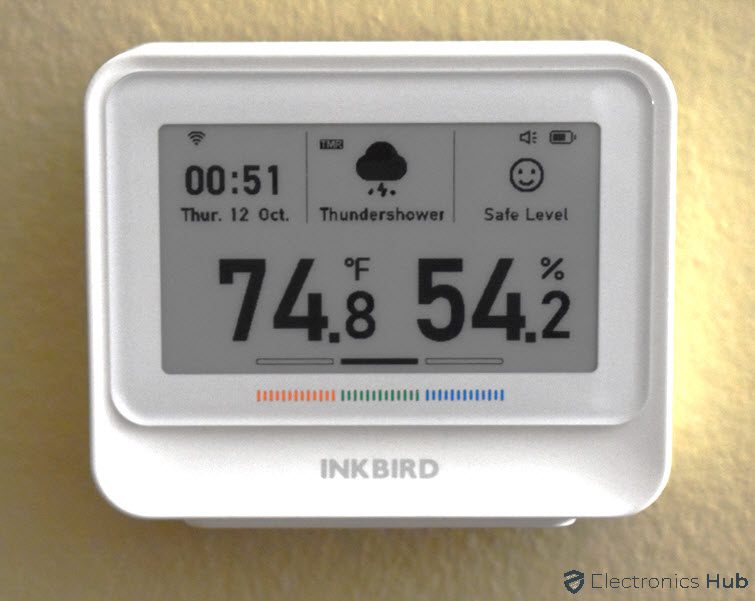 In addition to these features, the IBS-TH5-Wi-Fi provides a comfort level indicator that ensures your environment remains comfortable and pleasant. If the humidity is less than 30%, it will indicate it as “Dry”. For the comfort level to be, well, “Comfort”, the humidity must be in the range of 30% < Humidity < 60% and the temperature must be in the range of 68°F < Temperature < 78.8°F. If the humidity is more than 60%, then it indicates “Wet” on the display.