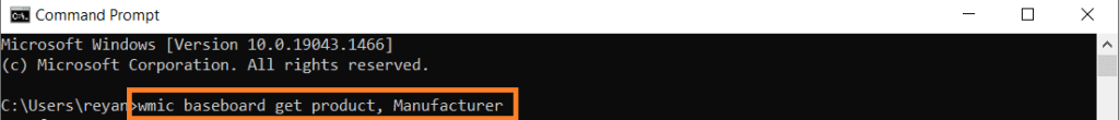 2. Once the command prompt window opens, type wmic baseboard get product, Manufacturer.