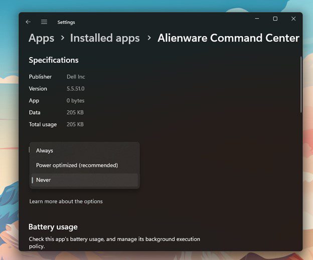 - Here, select Advanced Options and select Never under Background Apps Permissions.