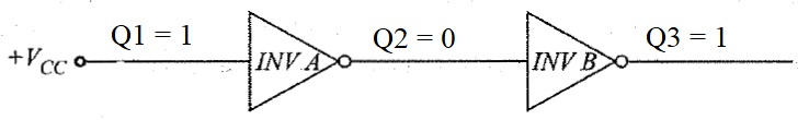 Let Q1 be the input and Q3 be the output. Initially, assume the feedback is disconnected and Q1 is made 0 (Logic 0, LOW, bit 0) by connecting it to ground. The Q3 will also be 0. Now, if the feedback is connected and the input Q1 is disconnected from ground, the Q3 will still continue to be at 0.