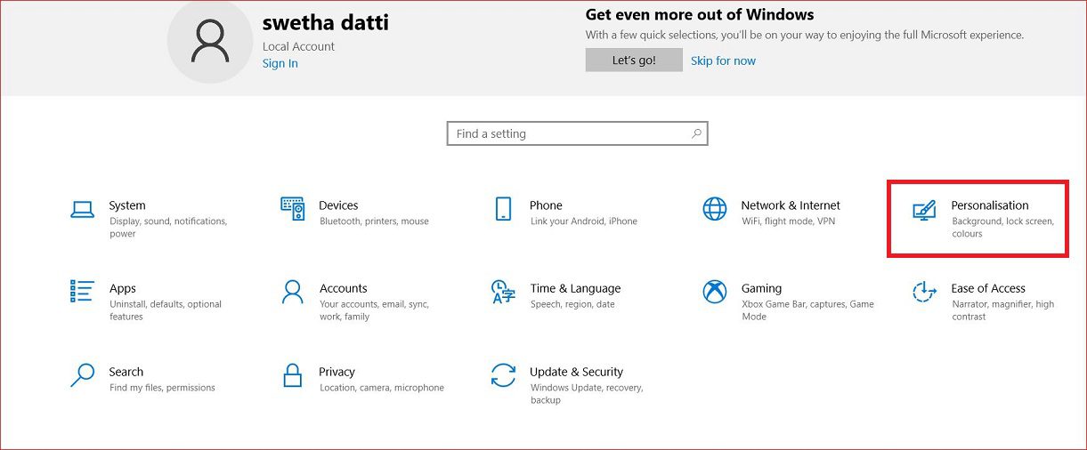 Step 1: Open the start menu by clicking on the Windows logo. Navigate to Settings and then to Personalization.