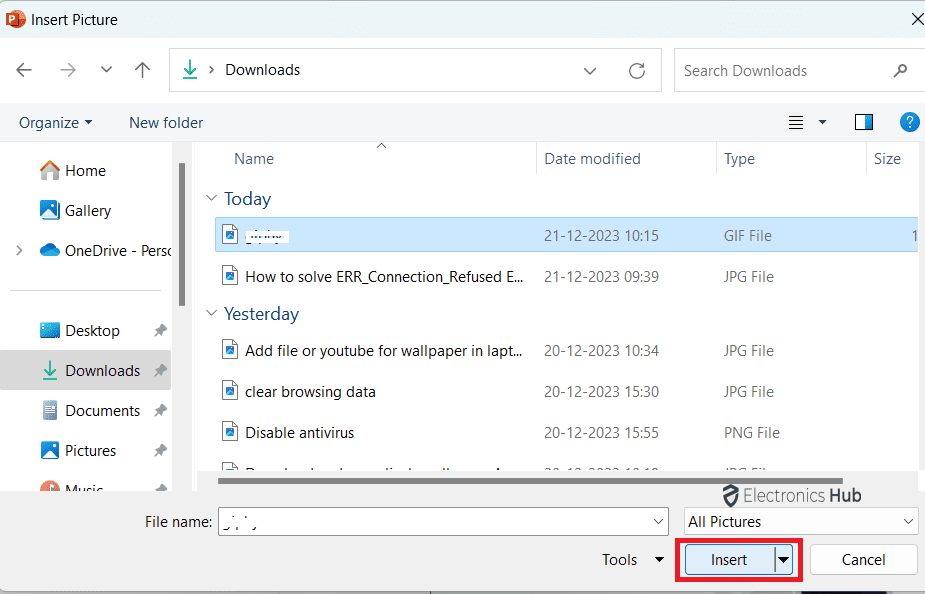 - Choose the downloaded GIF file from your computer and click “Insert.”