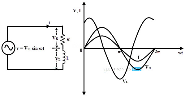 In series RL circuit, the voltage across the inductor is out of phase with both current flowing through the circuit and voltage across the resistance as shown in above figure. The induced voltage in the inductor opposes the flow of current and hence VL leads the current I and drop across resistance VR by 900.