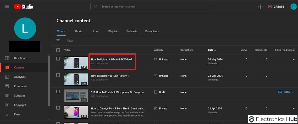 - Go to Your Channel: Click on your 3 lines at the top left corner of the page and select ‘Your Videos’. Navigate to the ‘Videos’ tab where all your uploads are displayed.