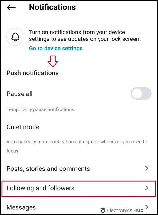 - In the ‘Push Notifications’. Click on “Following and Followers.”
