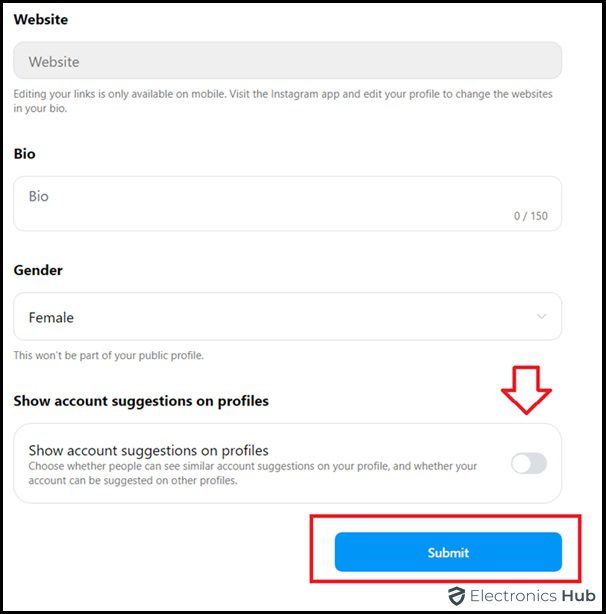 - Click “Submit” to save your settings. Your profile will no longer be suggested to others on Instagram.