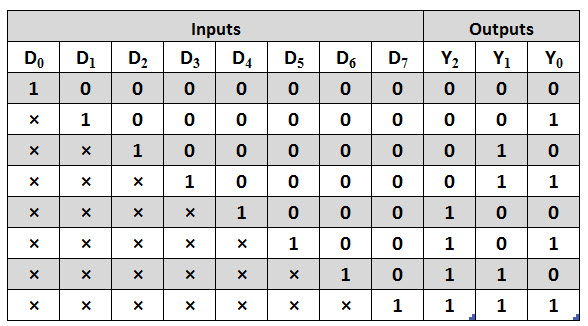 Suppose if the input lines D2, D4 and D7 are logic 1 simultaneously irrespective of the other inputs, only D7 will be encoded and the output will be 111. Similarly, if D3 = 1, the state of D2, D1 and D0 is irrelevant or don’t care and the output is equal to 011.
