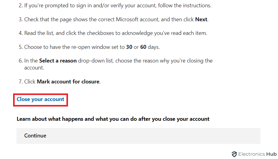 - Scroll down on the next page, select “Continue with Closing Your Account,” then scroll down again and select it once more.