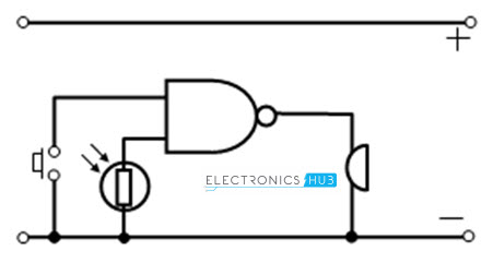 This circuit consists of NAND gates connected in the form of a simple latch circuit. When the switch is connected to ‘A’, the buzzer inputs will be off. At this condition there is no effect of LDR (which is connected as one of the inputs of Latch) on the circuit. But when the switch is at ‘B’ then the buzzer will be ON due to the effect of LDR. The buzzer will sound simultaneously the light or flash light also flashes up to alert. Buzzer can be turned off only by returning the switch to position ‘A’.