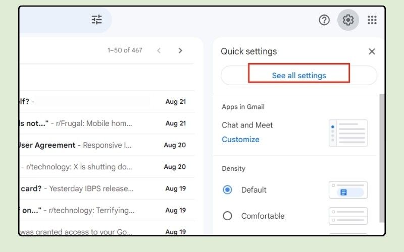 - Open Gmail And Access Settings: Start by opening Gmail on your desktop. In the upper right corner, click on the Settings icon (a gear-shaped icon).