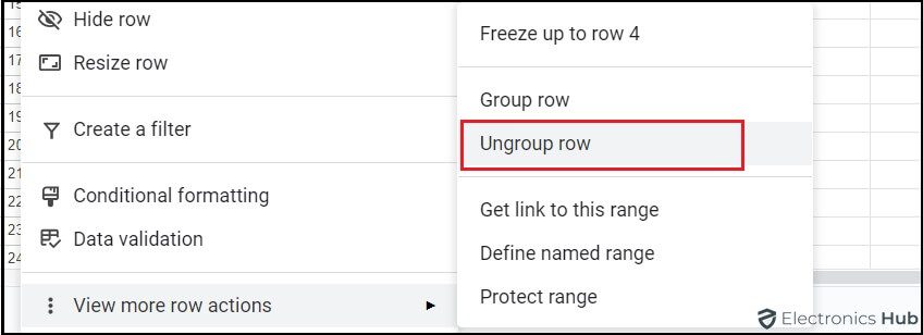 - Alternatively, Right-click on any grouped row or column. Select “View more row actions” or “View more column actions,” based on what you need to ungroup. Choose “Ungroup Rows” or “Ungroup Columns” from the drop-down menu.